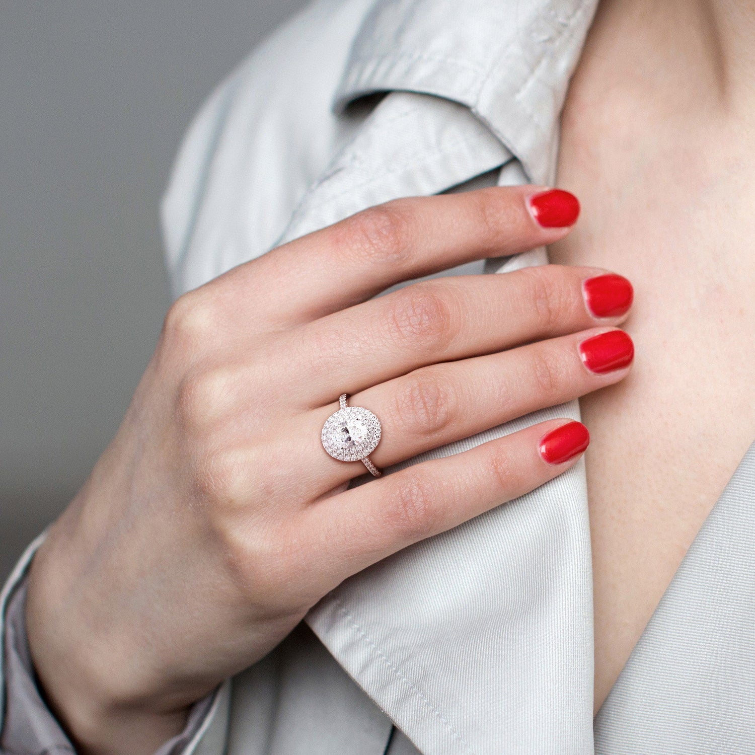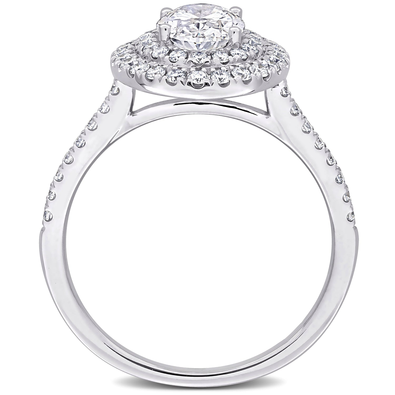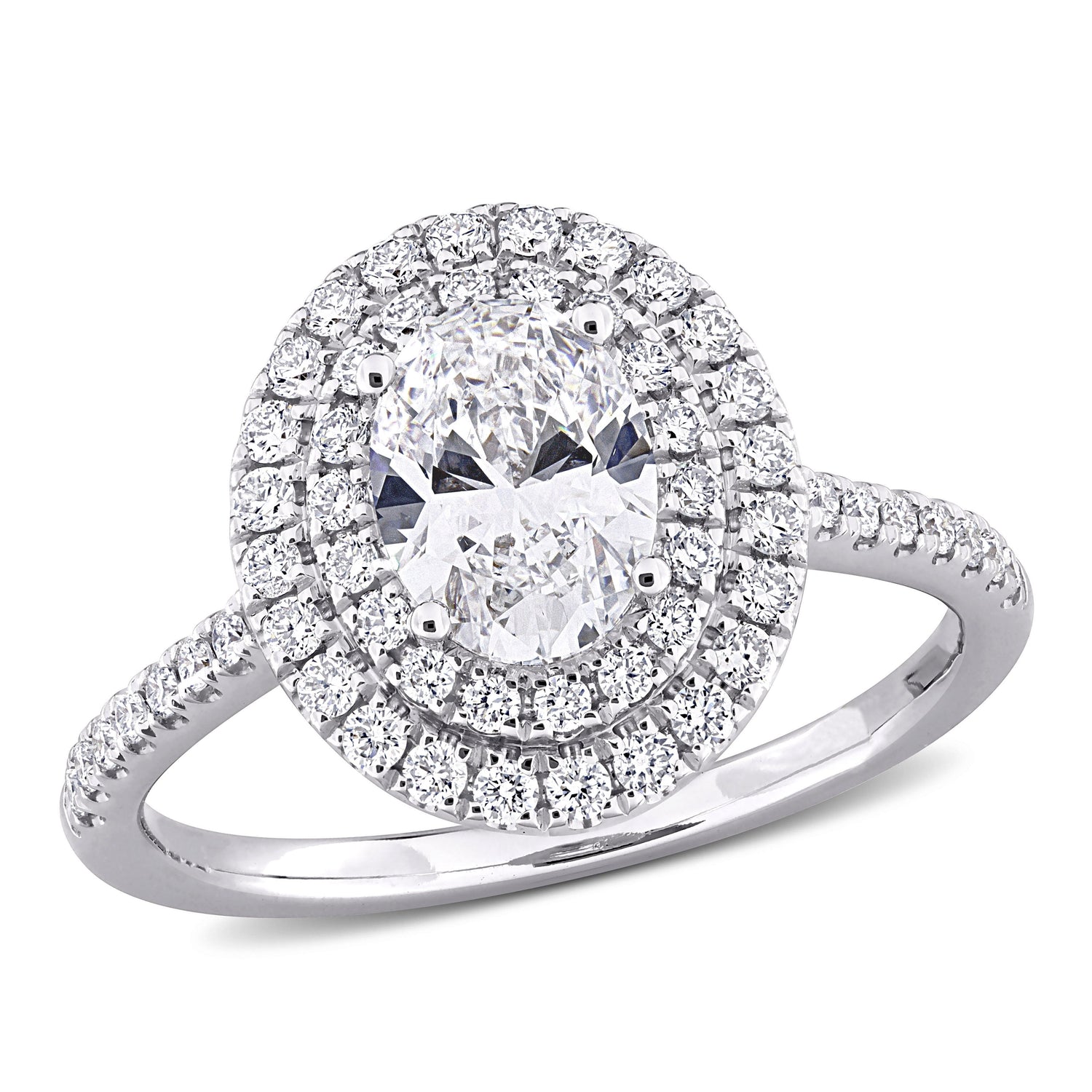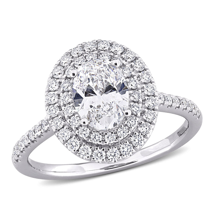 Meticulously crafted in 14k white gold featuring a 1 1/2 carat total weight oval lab-grown diamond, surrounded by a double halo of smaller lab-grown diamonds.