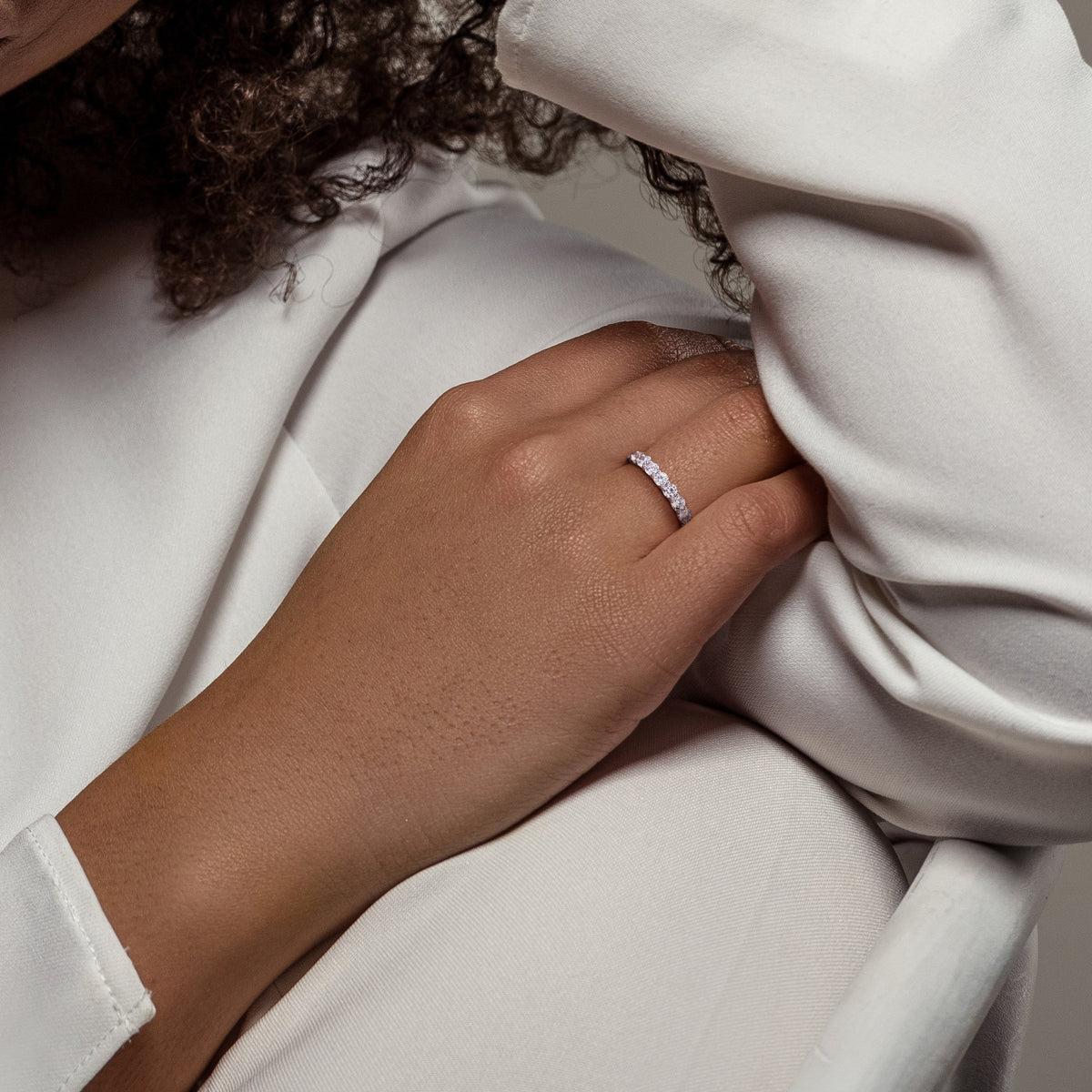 This Created Forever 2 1/10ct Lab-Grown Diamond Eternity Band is a delicate and radiant symbol of eternal love. Set with 21 dazzling round-cut lab-created diamonds in luminous 14k white gold, this eternity band shines from every angle. Perfect for stacking or wearing alone, it celebrates milestones with timeless grace.