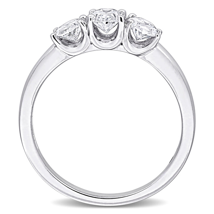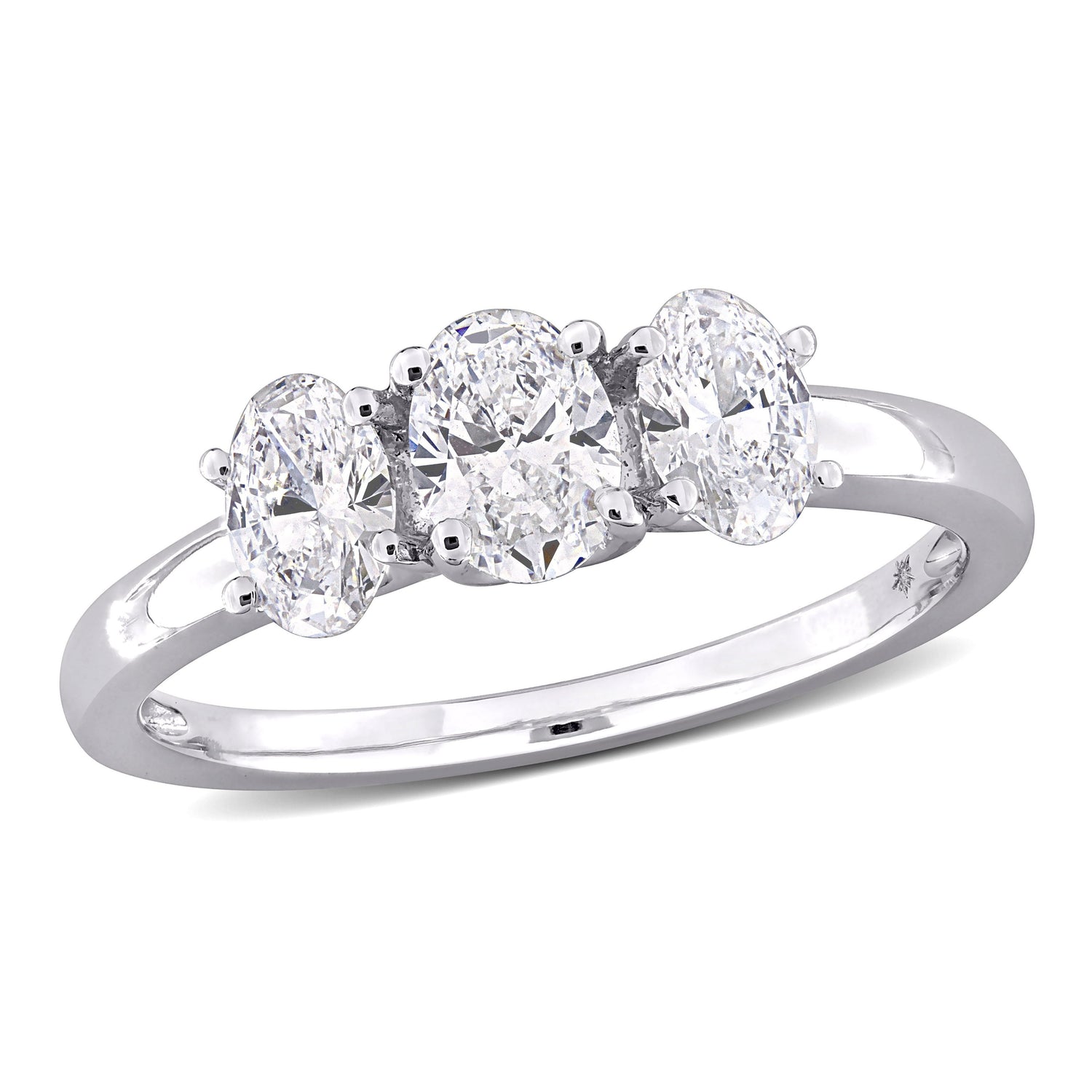 1ct TW oval-shaped lab-grown diamonds, 14k white gold band, three-stone setting.