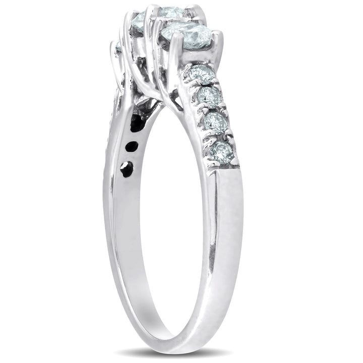 Crafted in 14k white gold with three round cut genuine diamonds and eight round cut accent diamonds (I2-I3 clarity, G-H color), totaling 1 1/10 carats. Prong-set for lasting beauty.