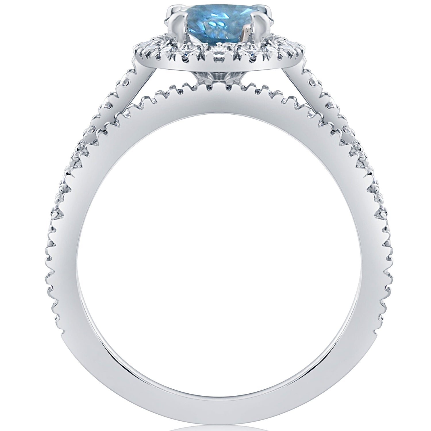 1 1/2 ct Blue Diamond Halo Engagement Wedding Ring Set 14k White Gold