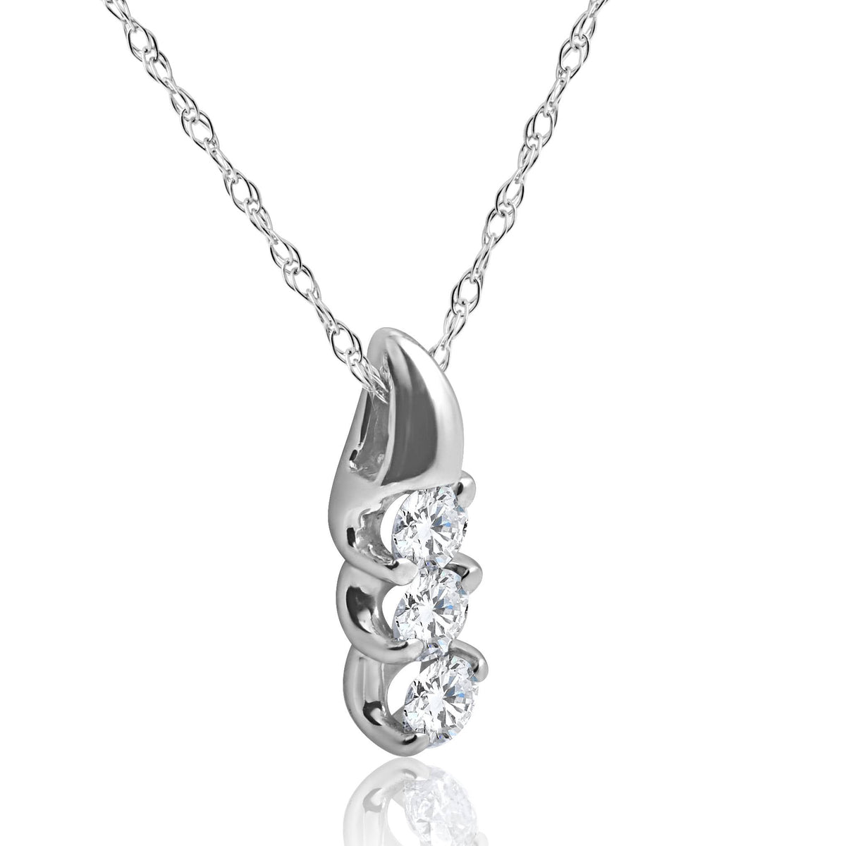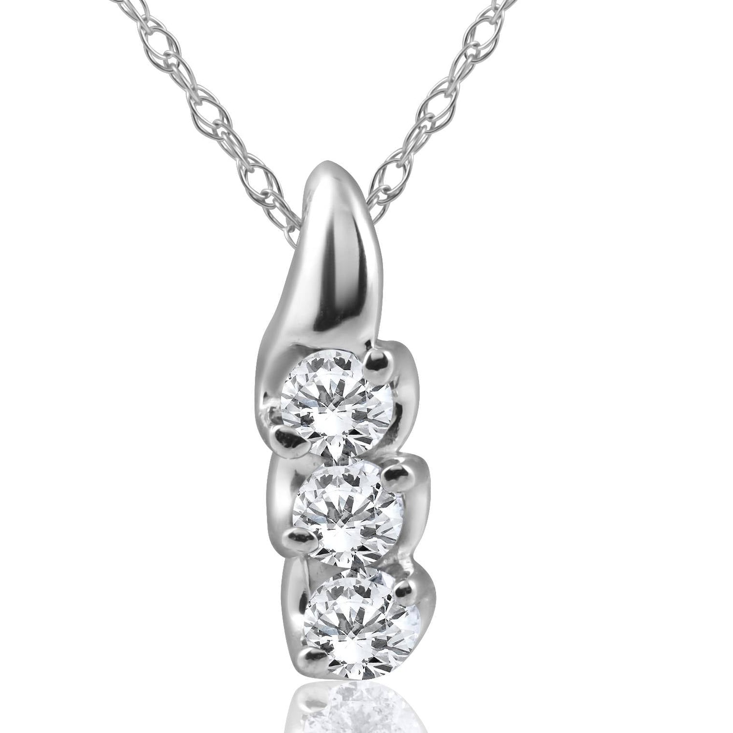 The 1/3ct Three Stone 3 Diamond Pendant in 14K White Gold by Pompeii3 symbolizes the past, present, and future with three graduated round brilliant cut natural diamonds. Set in 14k white gold, it is the perfect gift for someone special.