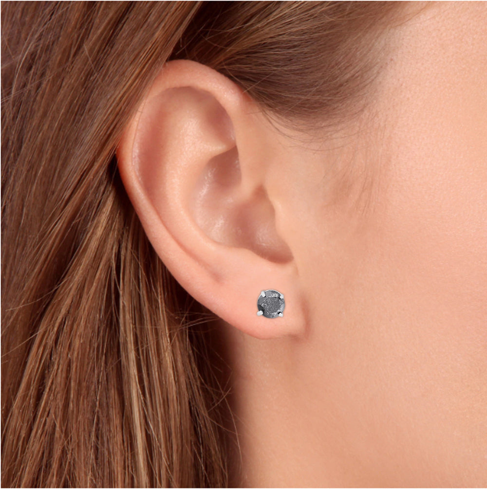 Crafted in solid 14k white gold with a round brilliant cut black color enhanced natural diamond. Prong set and secured by a white gold push back. 1ct total weight.