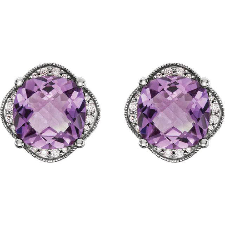 Crafted in 10k white gold with two 10mm amethyst gemstones and 32 round brilliant cut diamonds. Secured by 10k white gold push backs.