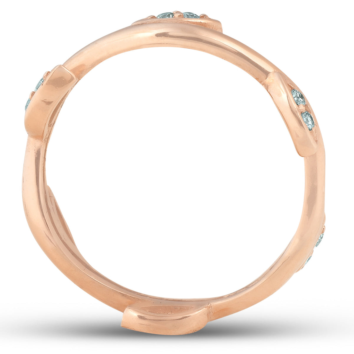 Crafted in 14k rose gold with round cut natural diamonds (I2-I3 clarity, H-I color), totaling 1/8 carat. Vine leaf design encircles the band.
