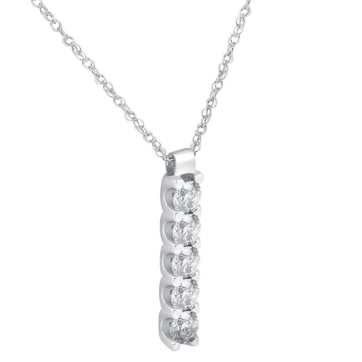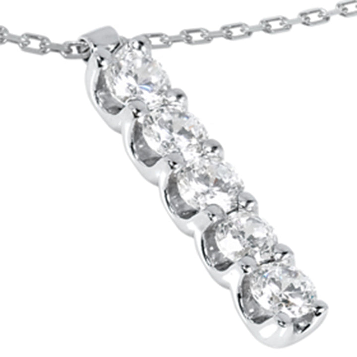 This 14K White Gold 1 1/4ct Journey Genuine Diamond Pendant by Pompeii3 symbolizes life’s milestones with elegant sparkle. Featuring five 1/4ct round brilliant-cut natural diamonds, each prong-set in 14k white gold, it gracefully curves along an 18' clasp lock chain for a classic, meaningful design.