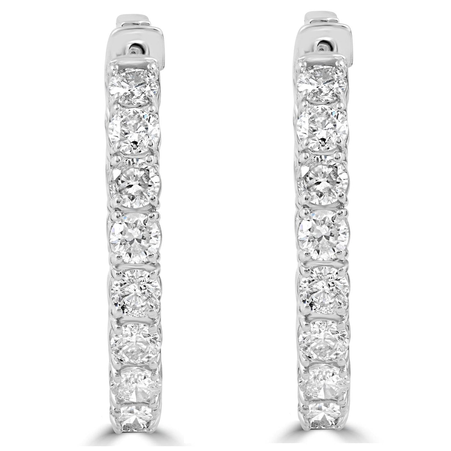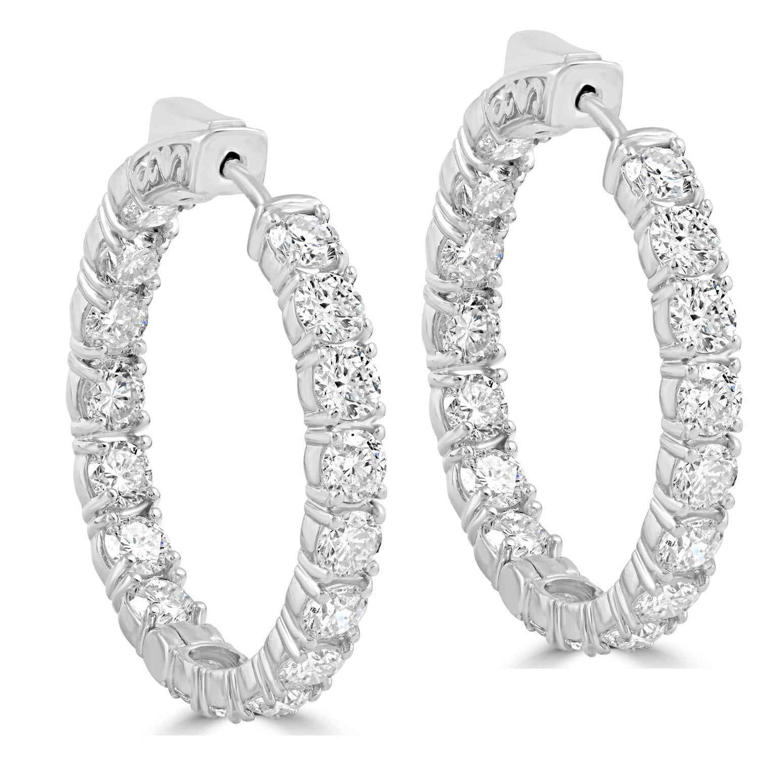 Handcrafted in solid 14k white gold with 34 round cut diamonds totaling 6.13 carats. Hoops measure 30mm tall with vault lock snap closure.