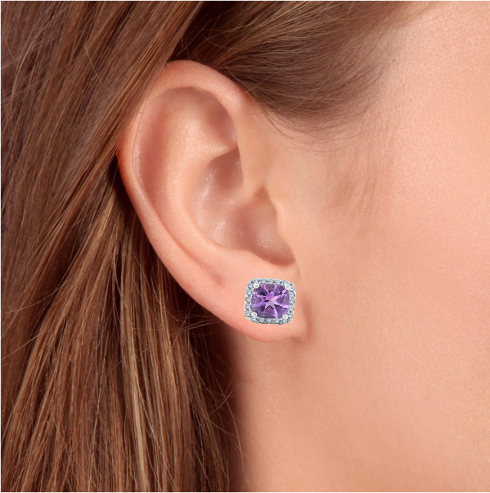 These 3ct Pave Halo Amethyst Studs by Pompeii3 are vibrant and luxurious, combining cushion-cut amethyst gemstones with a delicate halo of diamonds for a regal finish.