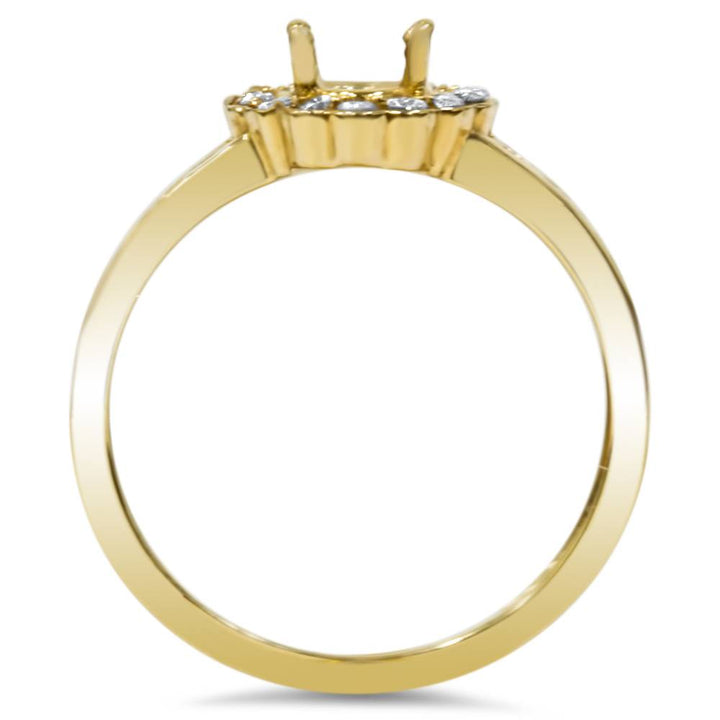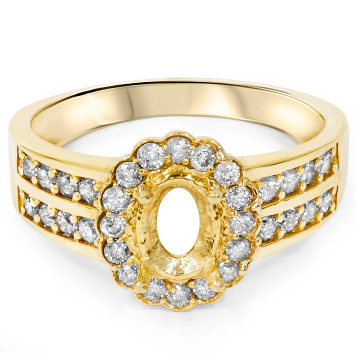 Handcrafted in solid 14k yellow gold with round brilliant cut natural diamonds. 3/8ct total diamond weight. Mount ready to hold a 3/4ct oval stone (custom sizes available).
