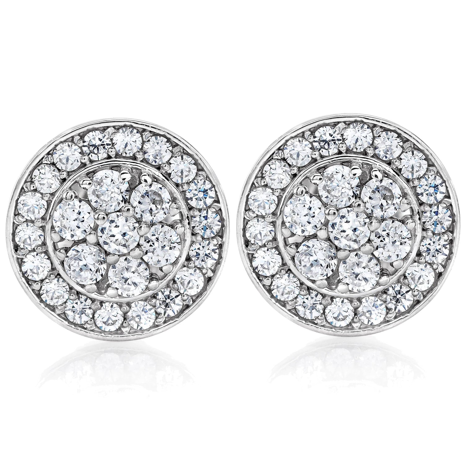Set in solid 10k white gold with 50 round-cut diamonds totaling 1/2 carat. Earrings measure approximately 1/3'. Diamond clarity: I2-I3; color: H-I.