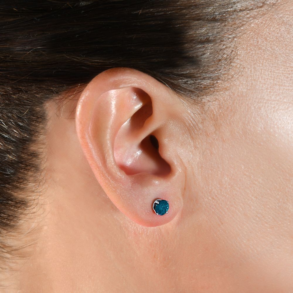 Handcrafted in 14k white gold with 1 1/4 carat total weight matching round brilliant cut lab-grown blue diamonds (I2-I3 clarity). Prong set with push-back closures.