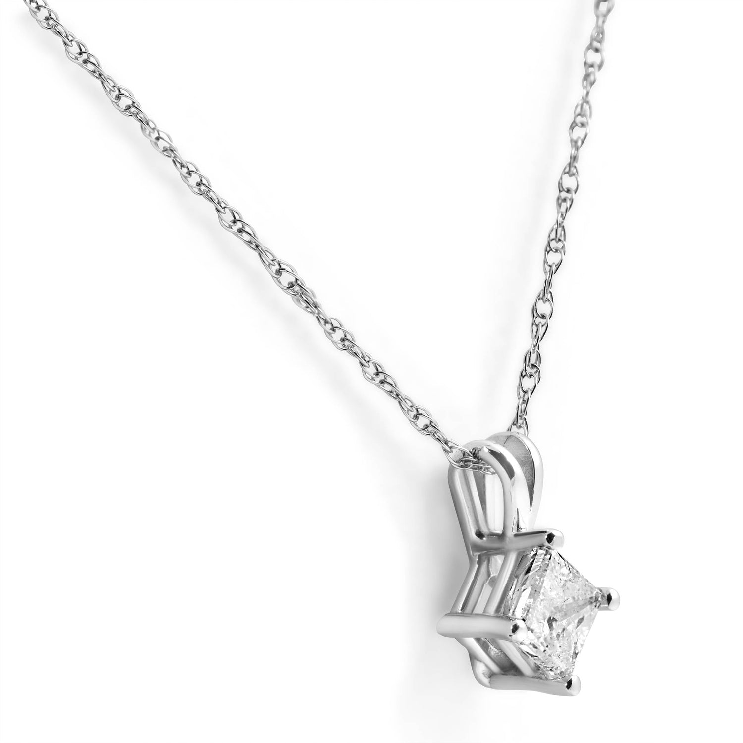 Handcrafted in solid 14k white gold with a princess-cut diamond totaling approximately 1/3 ct. Diamond color J-K. Includes 18' chain.
