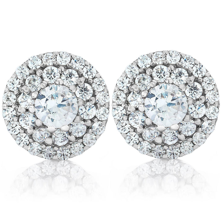 These Double Halo Diamond Screw Back Studs by Pompeii3 offer exceptional brilliance with two 3mm round center diamonds surrounded by 60 sparkling accents, perfect for glamorous elegance.