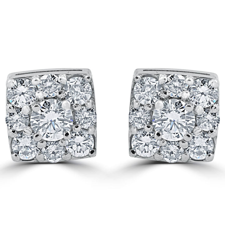These 1 1/5ct Cushion Halo Round Diamond Studs by Pompeii3 are designed for maximum sparkle. Larger round center diamonds are surrounded by a cushion-shaped halo, set in gleaming white gold, creating a bold yet classic statement.
