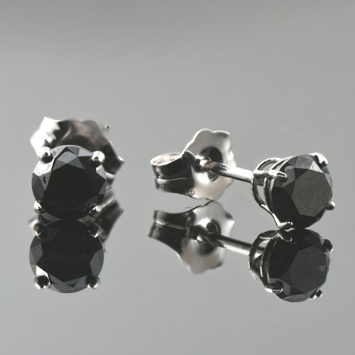 Set in solid 14k white gold with genuine round brilliant cut color-enhanced black diamonds totaling 1 carat. Secured with push backs.