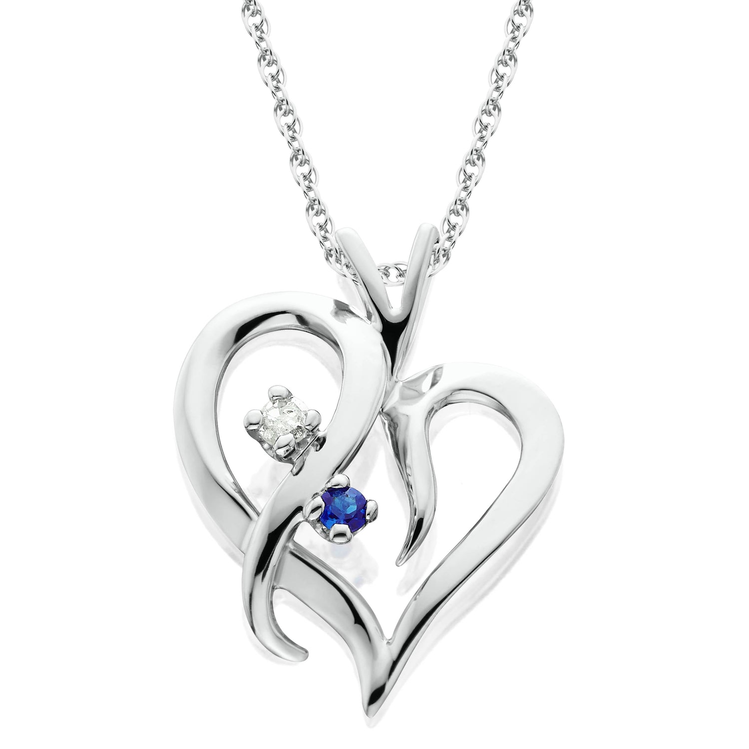 Crafted in solid 14k white gold with one round brilliant cut diamond and one round blue sapphire. Includes an 18' clasp lock chain. Pendant measures 1/2' tall.
