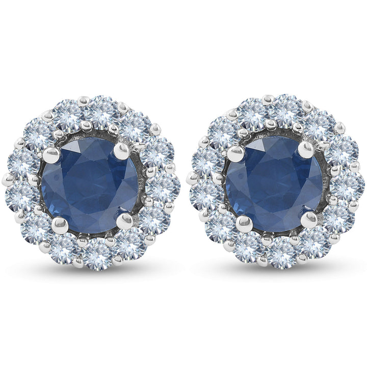 2 1/5 Ct Halo Diamond & Blue Sapphire Studs 14k White Gold