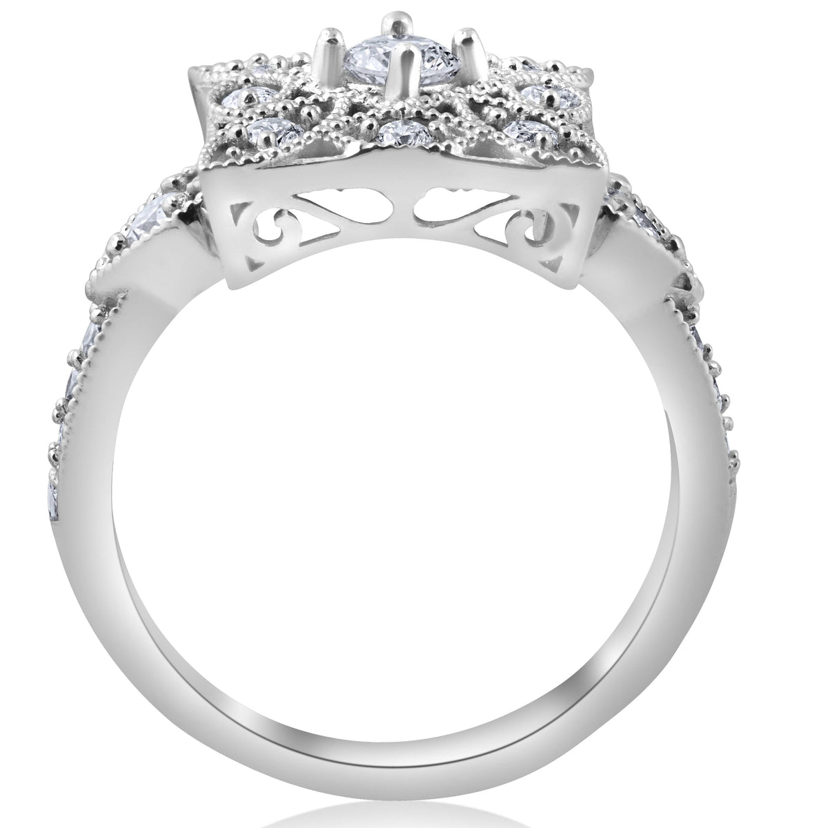 This 1/2ct Vintage Diamond Ring with Square Framed Filigree Band by Pompeii3 blends antique-inspired elegance with timeless charm. Set with round-cut natural diamonds in solid 10k white gold, this unique ring features delicate filigree detailing for a distinctive and romantic feel.