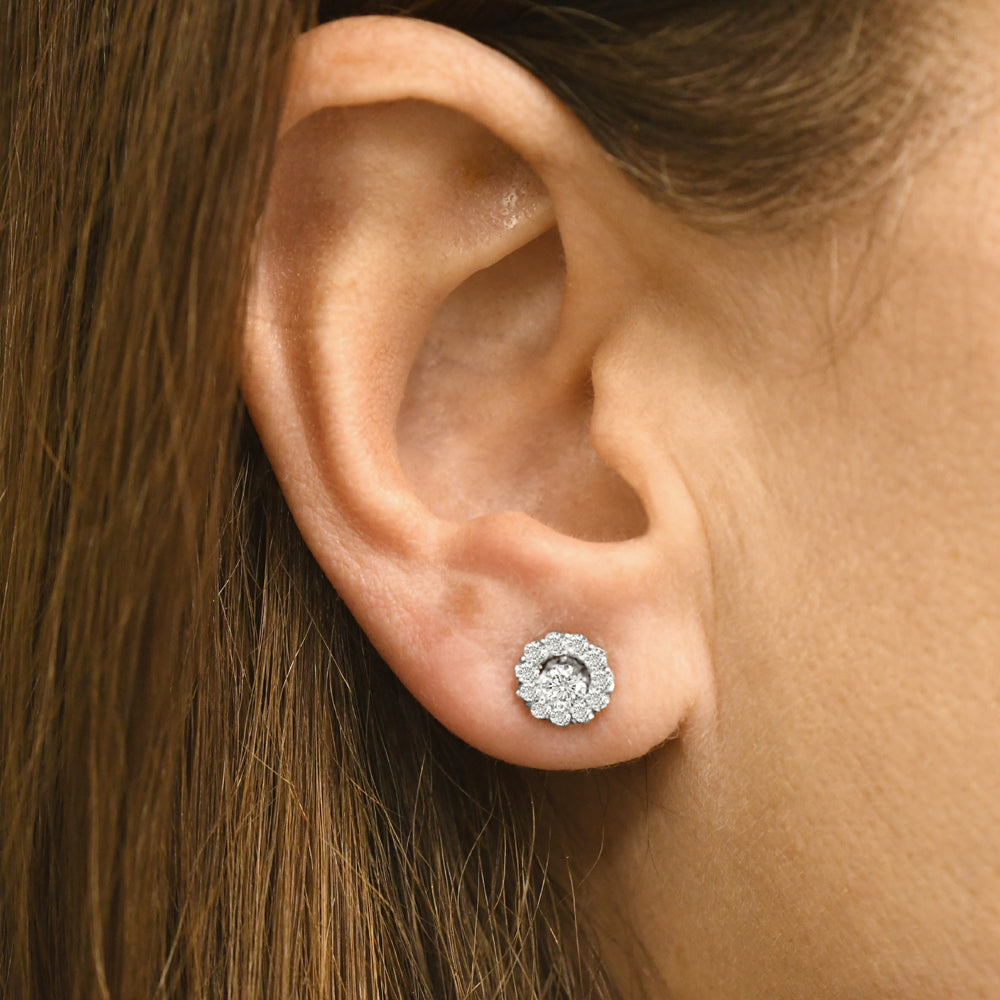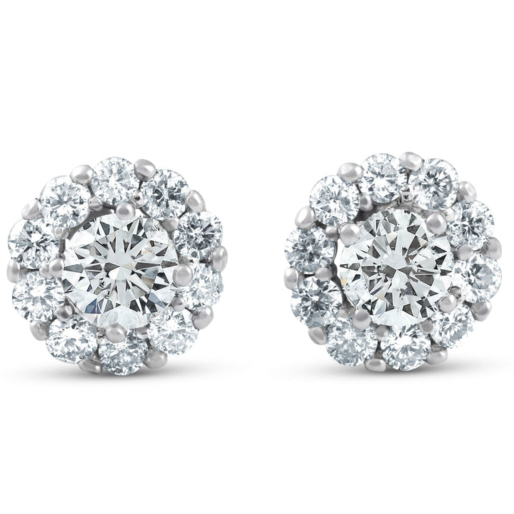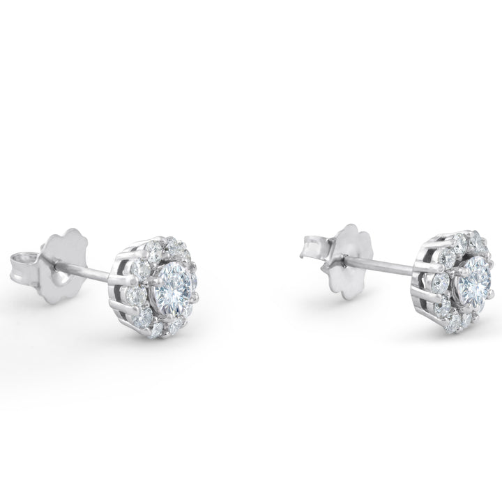 These 1ct Halo Round Diamond Studs by Pompeii3 showcase a luminous design with 1/4ct center stones encircled by delicate accent diamonds. The result is an exquisite pair of earrings that radiate brilliance and elegance.