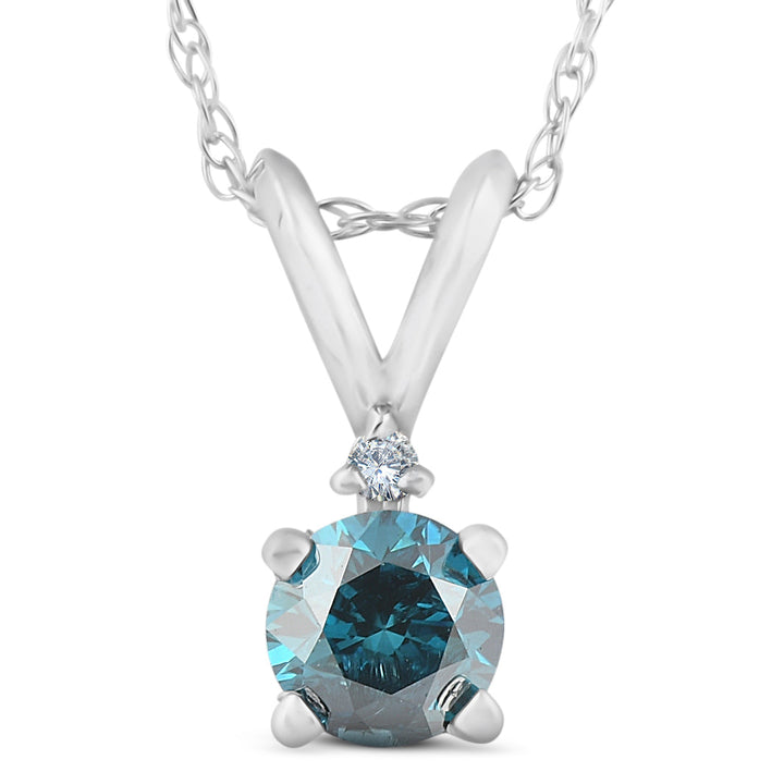 Handcrafted in solid 10k white gold with a 1/5ct treated blue diamond and 1/20ct white diamond. Includes an 18' 10k white gold clasp lock chain.