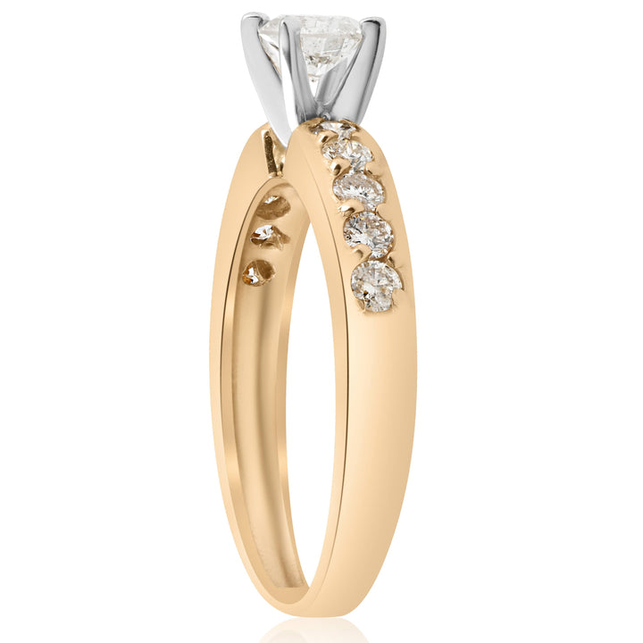 This 5/8ct Diamond Engagement Ring by Pompeii3 showcases classic elegance with a 1/3 carat center stone accented by ten sparkling diamonds. The warm hue of 14k yellow gold adds a vintage-inspired richness, making this ring both sophisticated and radiant — a perfect symbol of lifelong devotion.