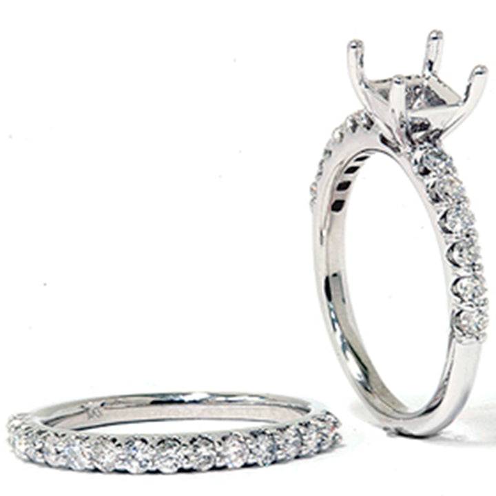 Handcrafted in 14k white gold with 27 round brilliant-cut natural diamonds (1ct total weight, I2-I3 clarity, G-H color). Ready to hold a 3/4–1 1/4ct square stone.