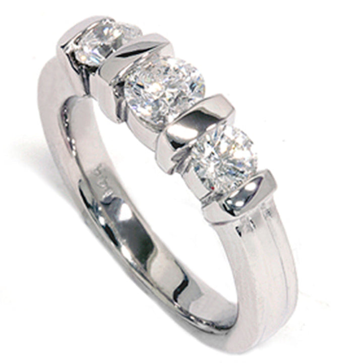 Handcrafted in solid 10k white gold with three round brilliant cut natural diamonds totaling 1 carat. Bar-set. Diamond clarity I2-I3, color G-H.