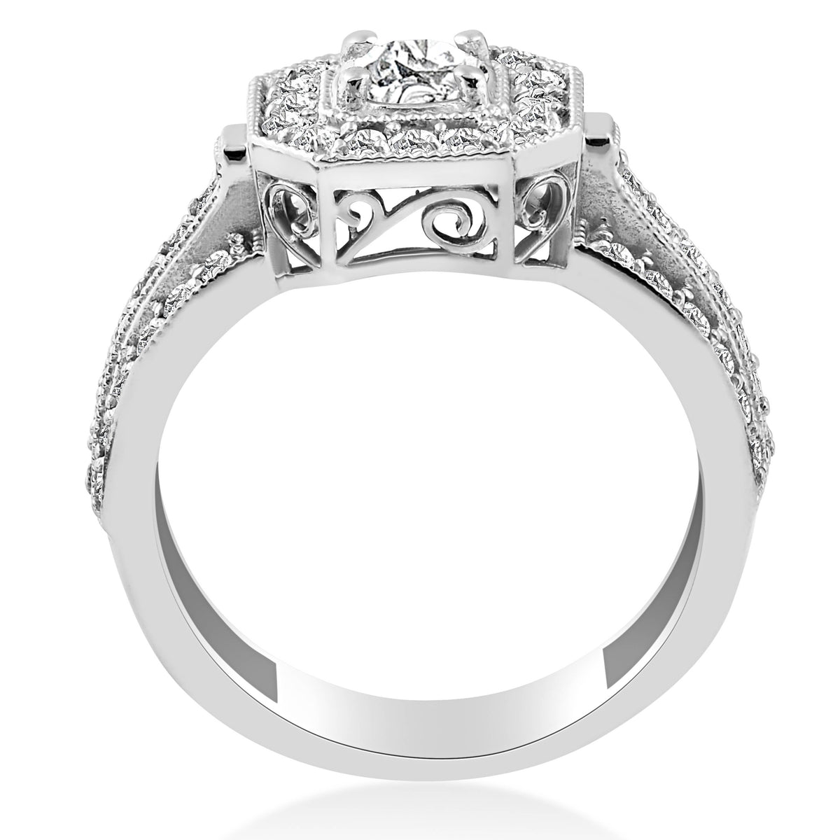 Made in solid 14k white gold with a 1/2ct center diamond and 54 round cut accent diamonds of G-H color and I2-I3 clarity.