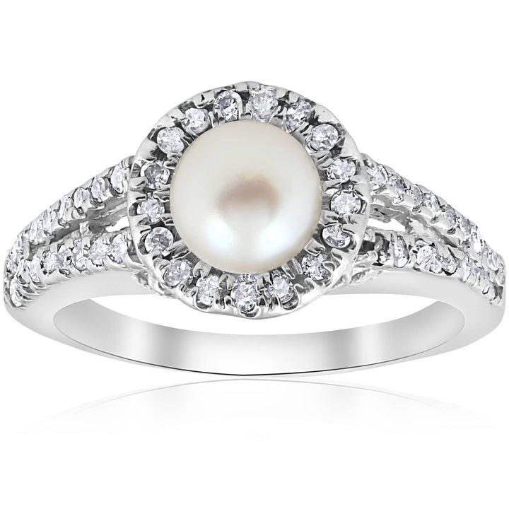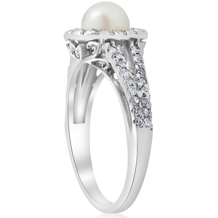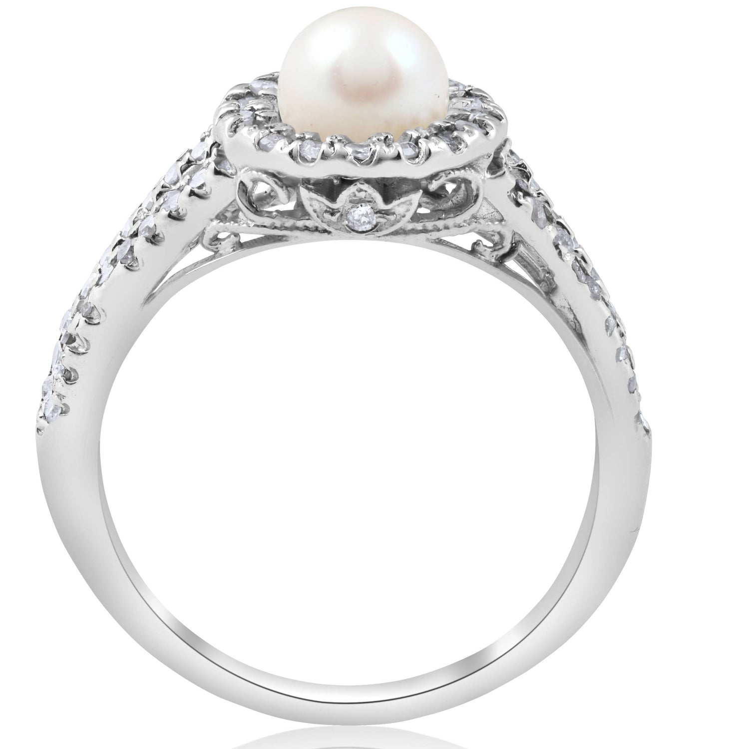 Solid 14k white gold featuring a 5mm genuine pearl and 59 round-cut diamonds. Diamond clarity I2-I3, color G-H.