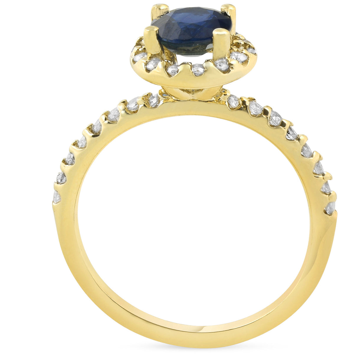 Set in solid 14K yellow gold, featuring a 5/8ct lab-created blue sapphire and round accent diamonds (total weight: 1 ct).