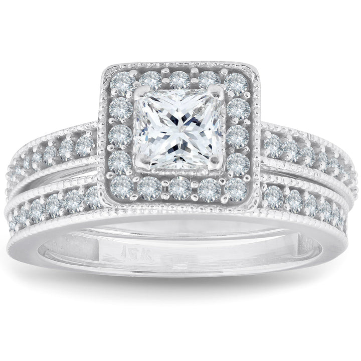 1ct Princess Cut Halo Diamond Engagement Wedding Ring Set 14K White Gold