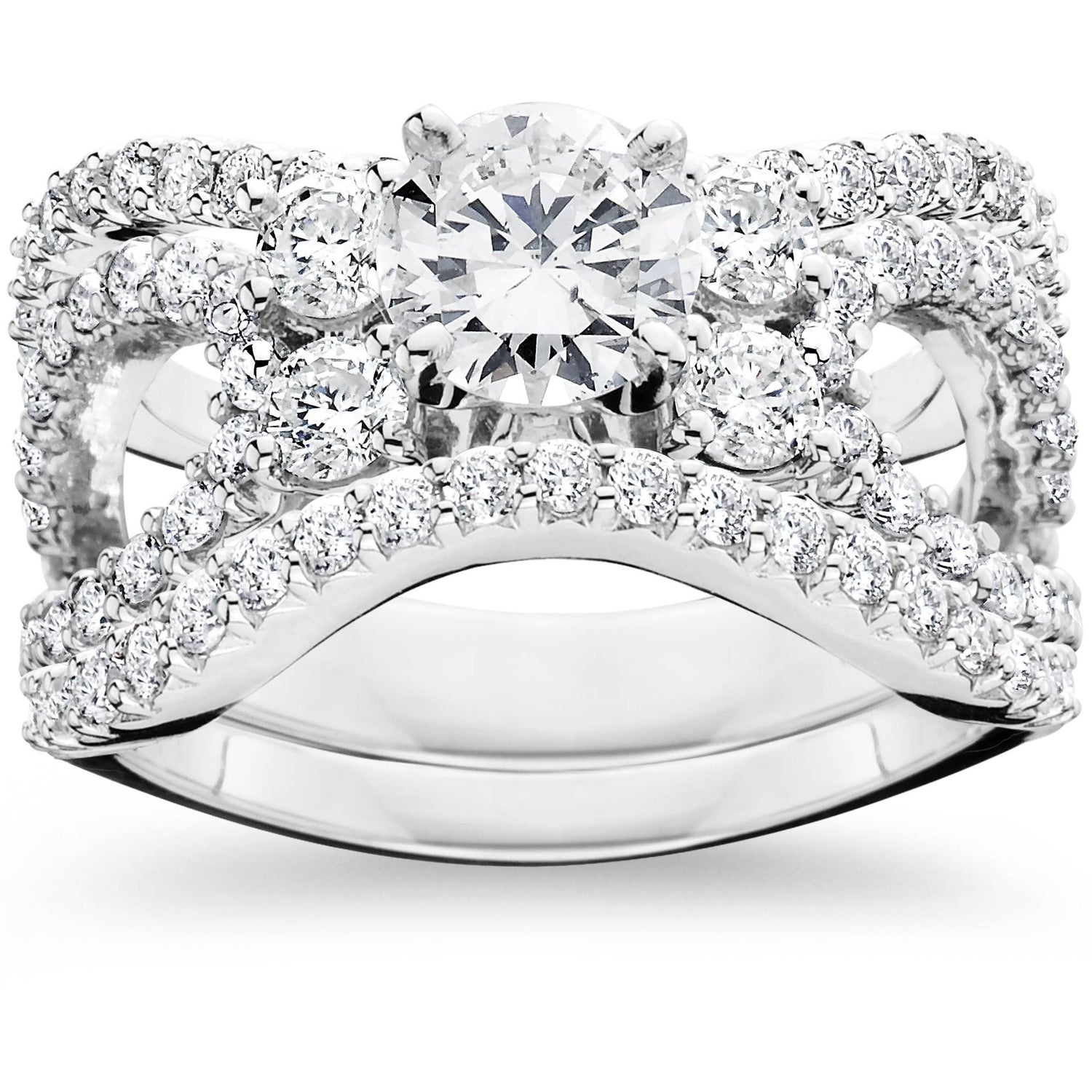 This 4.00CT Diamond Engagement Trio Wedding Ring Set by Pompeii3 is a bold and glamorous ensemble. With a 1ct center diamond surrounded by 154 round-cut diamonds, this set is a luxurious symbol of lifelong commitment.