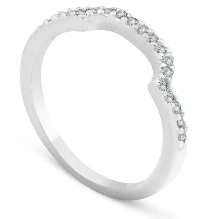 The 1/6ct Curved Notched Diamond Wedding Ring by Pompeii3 features a graceful curve designed to nestle perfectly with engagement rings, highlighted by nineteen glittering round diamonds for a touch of elegant sparkle.