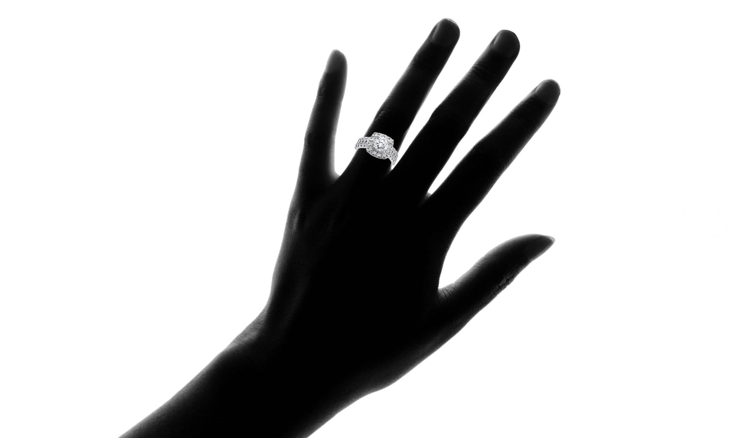 Handcrafted in solid 10k white gold with a 7/8ct center round diamond and round-cut accent diamonds (total weight 1.51 - 2.00 carats, I2-I3 clarity, G-H color). Made in the USA.