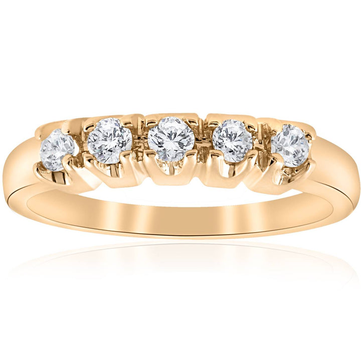 This 1/2ct Round Diamond Wedding Anniversary Ring by Pompeii3 features five round brilliant cut natural diamonds set in 14k yellow gold. The diamonds are securely prong set, offering a beautiful and timeless piece for celebrating love and commitment.