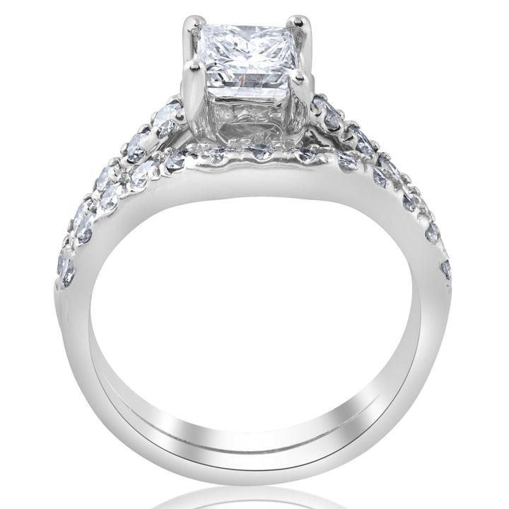 This 1 1/2ct Enhanced Princess Cut Diamond Engagement Ring Matching Wedding Band Set by Pompeii3 showcases a 1ct princess-cut lab-grown diamond. The matching wedding band features 23 round brilliant-cut diamonds, making this set a perfect choice for couples who appreciate modern elegance.