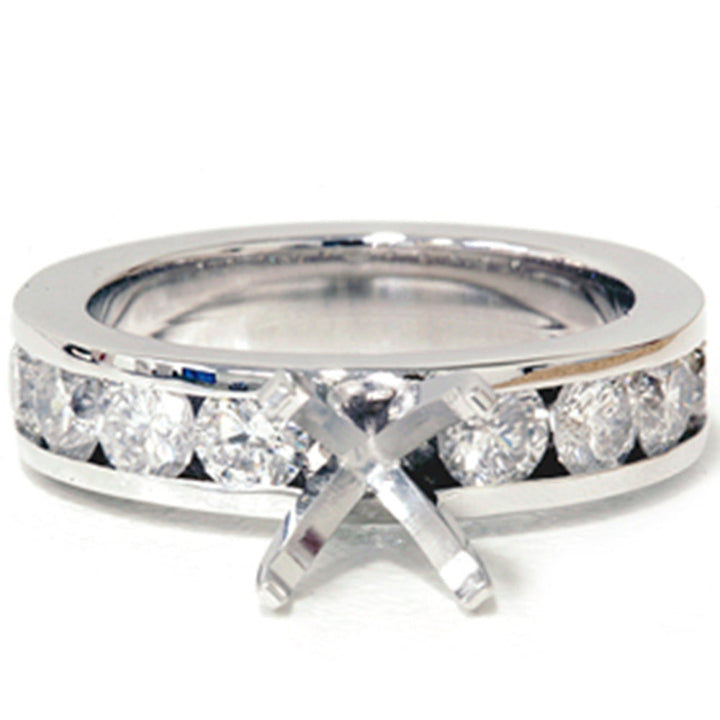 Handcrafted in 14k white gold with 1 1/2ct total of round brilliant cut natural diamonds, channel set. Mounting can accommodate up to a 2ct stone.