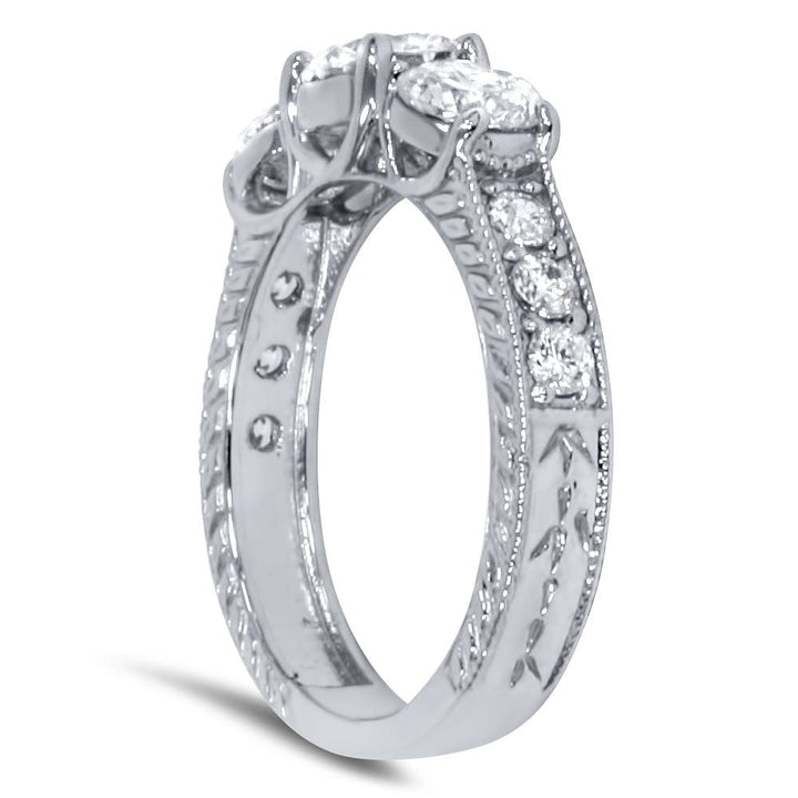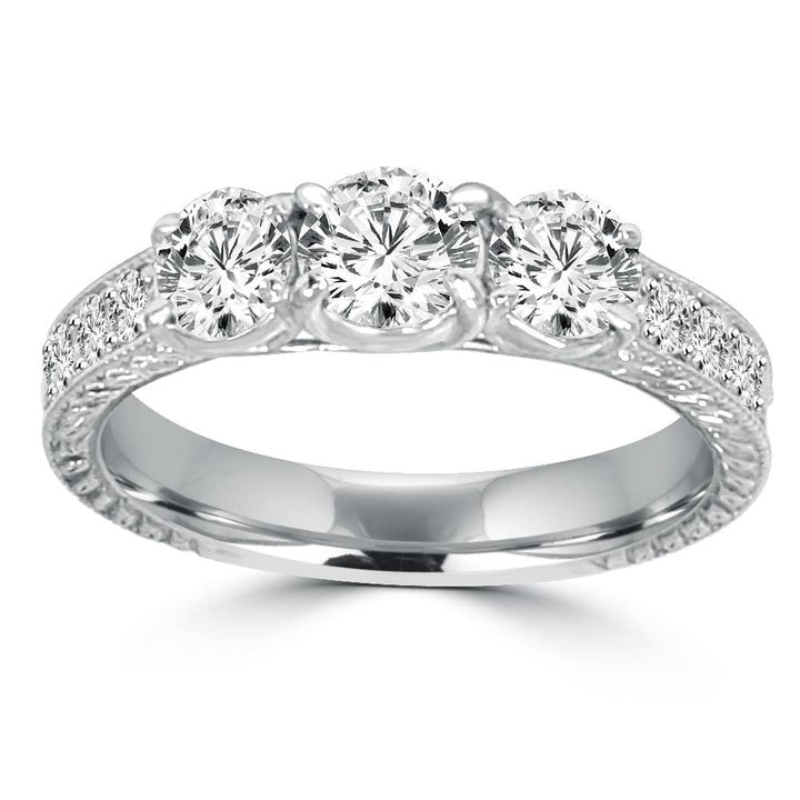 This 1 1/2ct Vintage Three Stone Round Diamond Engagement Ring by Pompeii3 radiates bold vintage elegance. A 5/8ct center stone is flanked by two 1/3ct diamonds and additional sparkling accents along the band, creating a striking and timeless design.