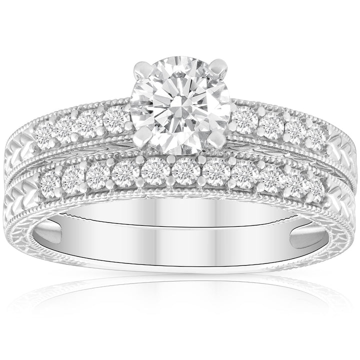 1 1/2 CT Diamond Engagement Ring & Matching Vintage Wedding Band Set White Gold