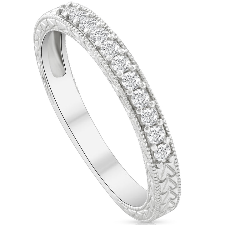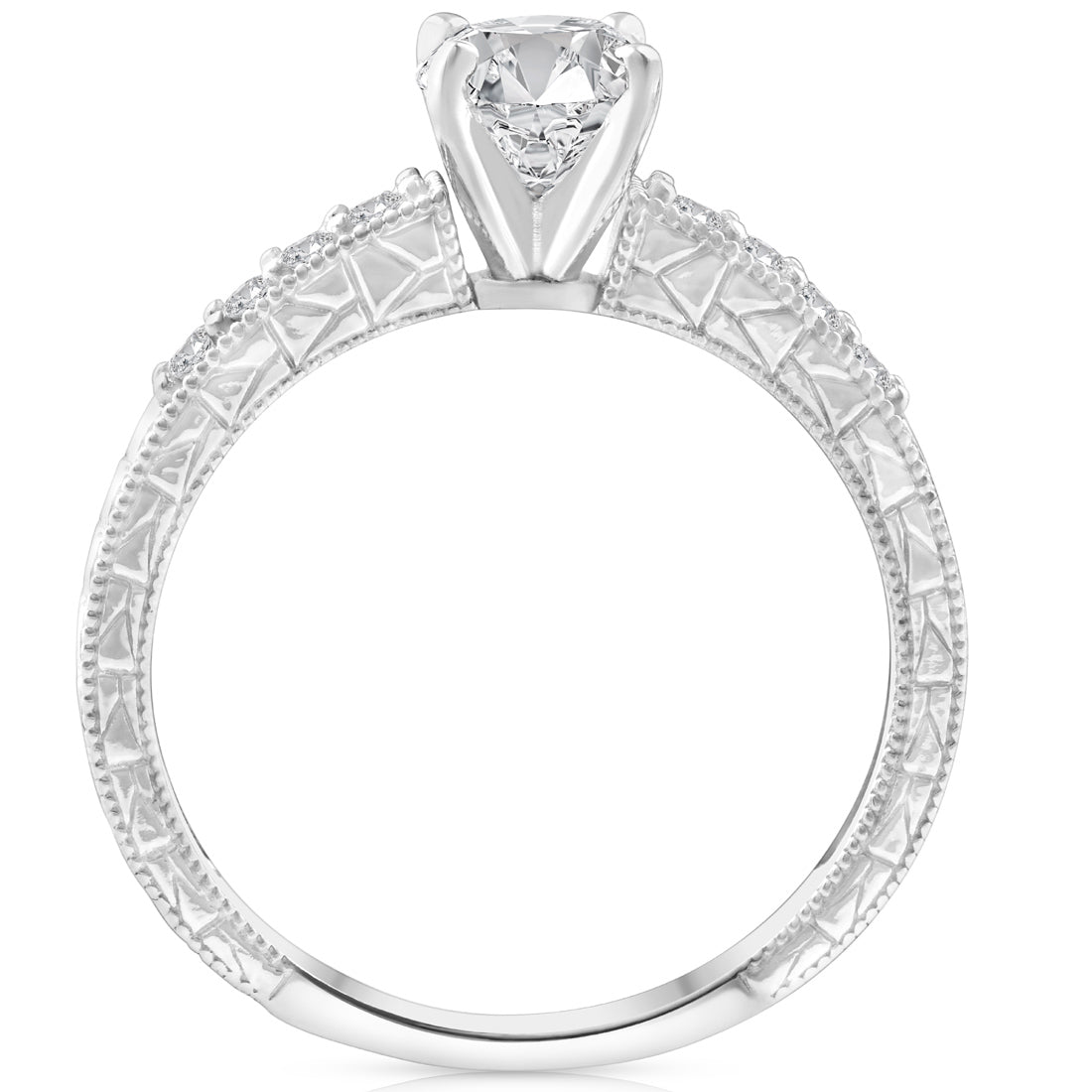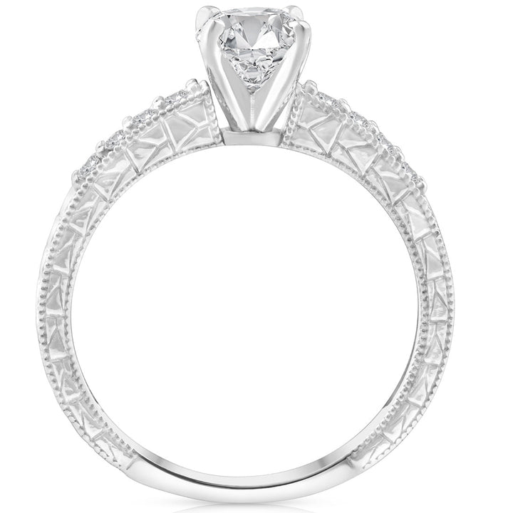 Crafted in solid 14k white gold with a 1ct round clarity-enhanced center diamond and 21 round cut accent diamonds. Hand-engraved vintage styling.