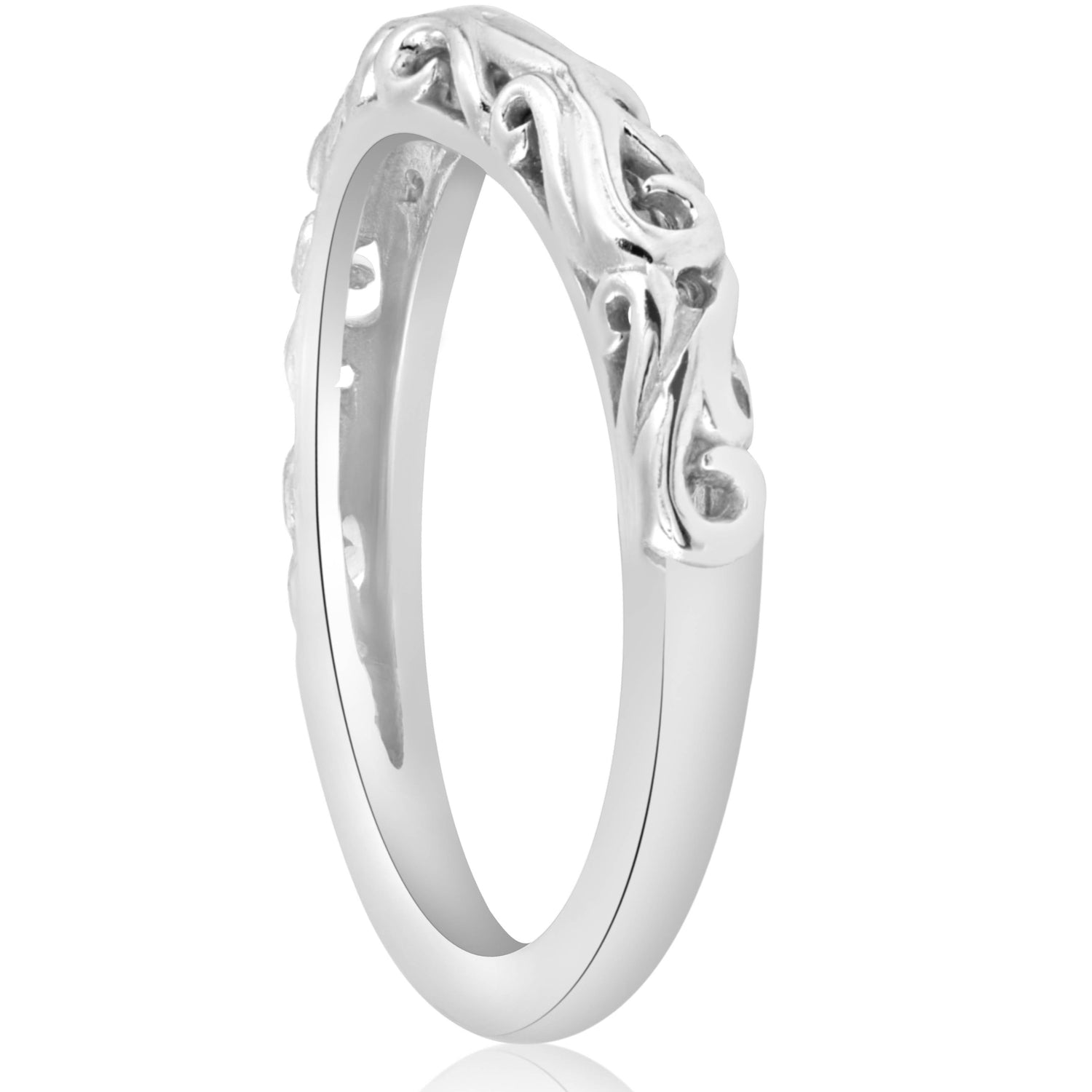 This Vintage 3mm Wedding Band in 14K White Gold by Pompeii3 is a beautifully crafted piece with a curved vintage style that pairs perfectly with engagement rings like item ENG50855E. The intricate design and timeless elegance of this band make it the perfect symbol of lasting love. Made from 14K white gold, it exudes classic beauty and will complement any style, whether modern or vintage-inspired.
