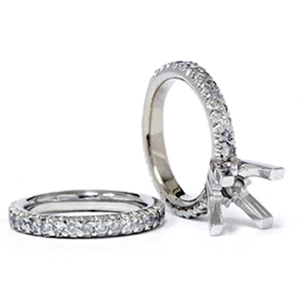 Crafted in solid 14k white gold with pave-set natural diamonds, totaling 1 1/2ct. The setting can hold up to a 1ct round or square stone.