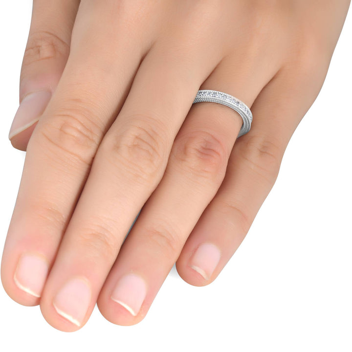 This Diamond Wedding Ring 1/5ctw Women's Stackable Diamond Band by Pompeii3 is a sleek and elegant band that features 22 round-cut natural diamonds, set in solid 10K white gold. Its stackable design makes it a versatile piece that can be paired with other rings or worn alone for a touch of sparkle. Perfect for any occasion.
