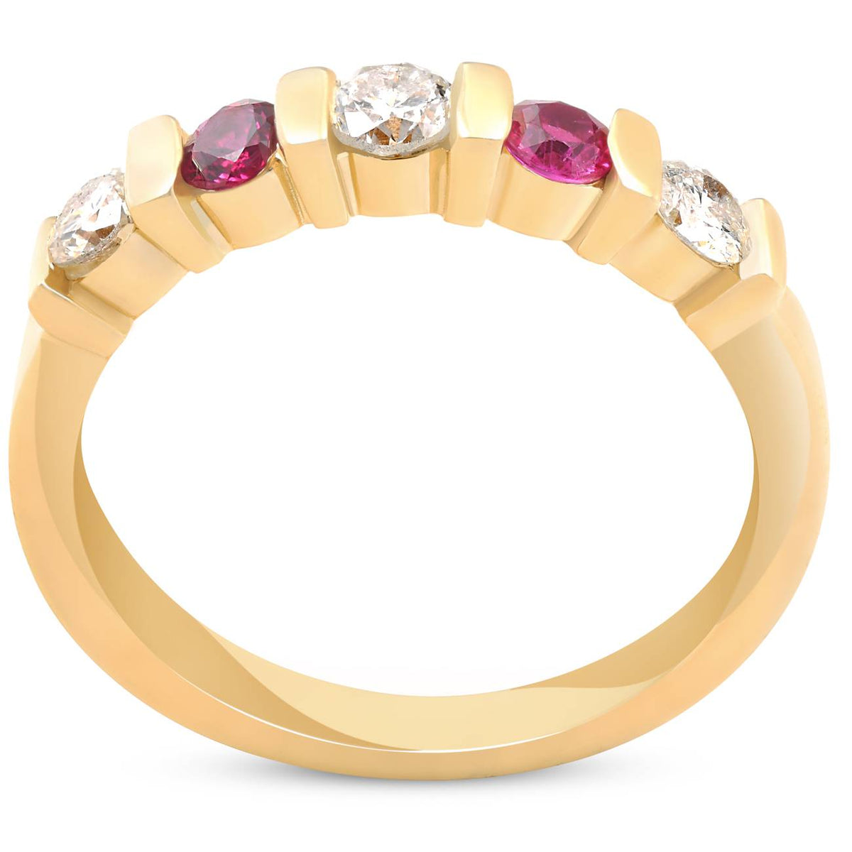 Handcrafted in 14k yellow gold with alternating round brilliant cut natural diamonds and rubies. Total gem weight of 1/2ct.