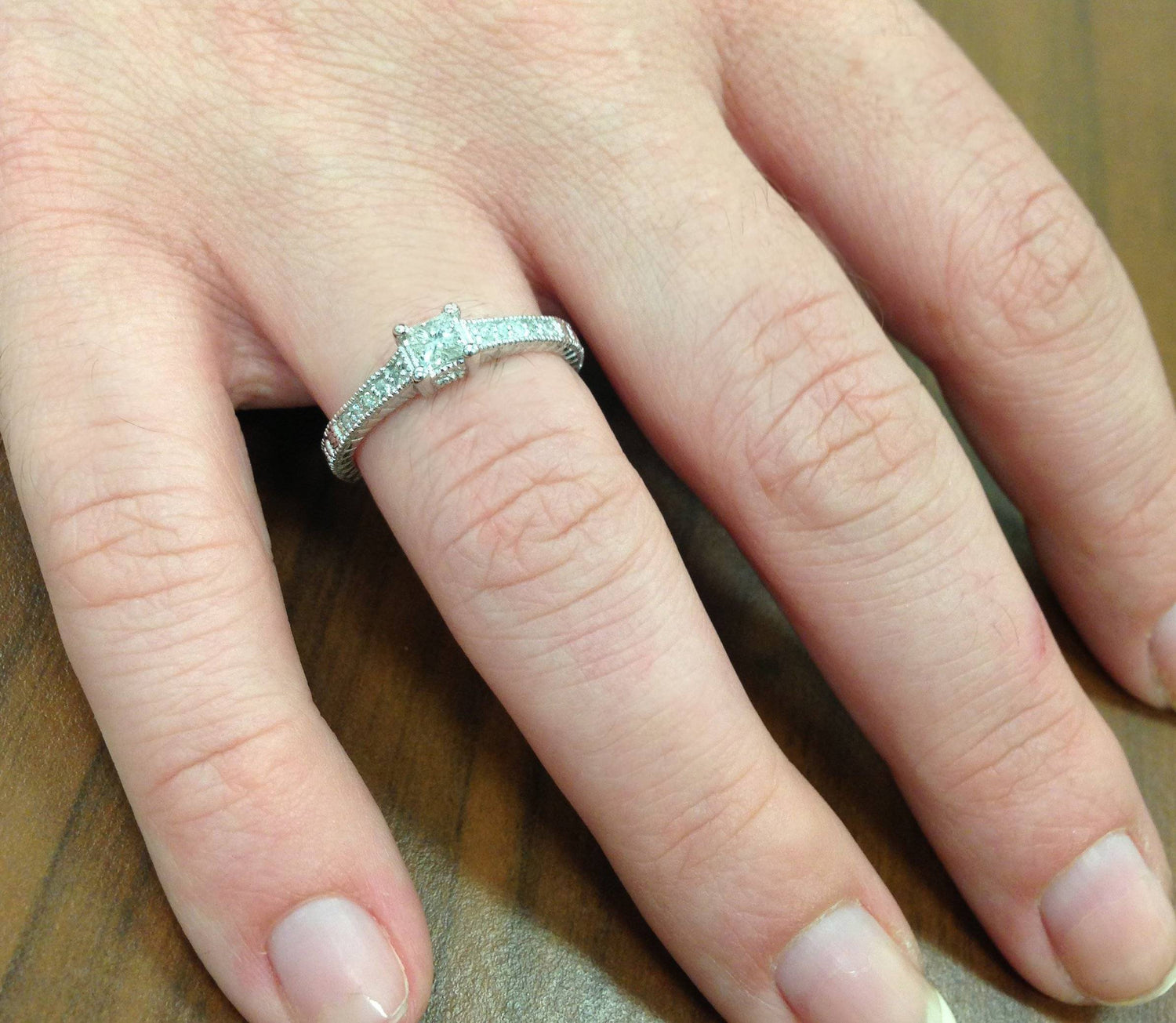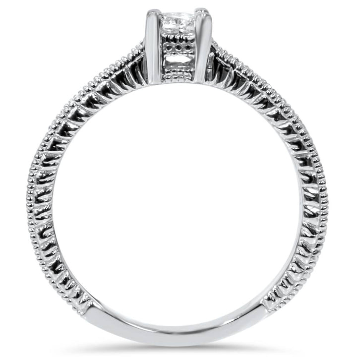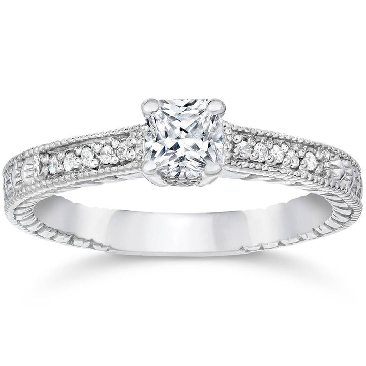 This 1/2ct Princess Cut Antique Vintage Diamond Engagement Ring by Pompeii3 evokes classic romance with a square-cut center diamond and intricate detailing for vintage elegance.