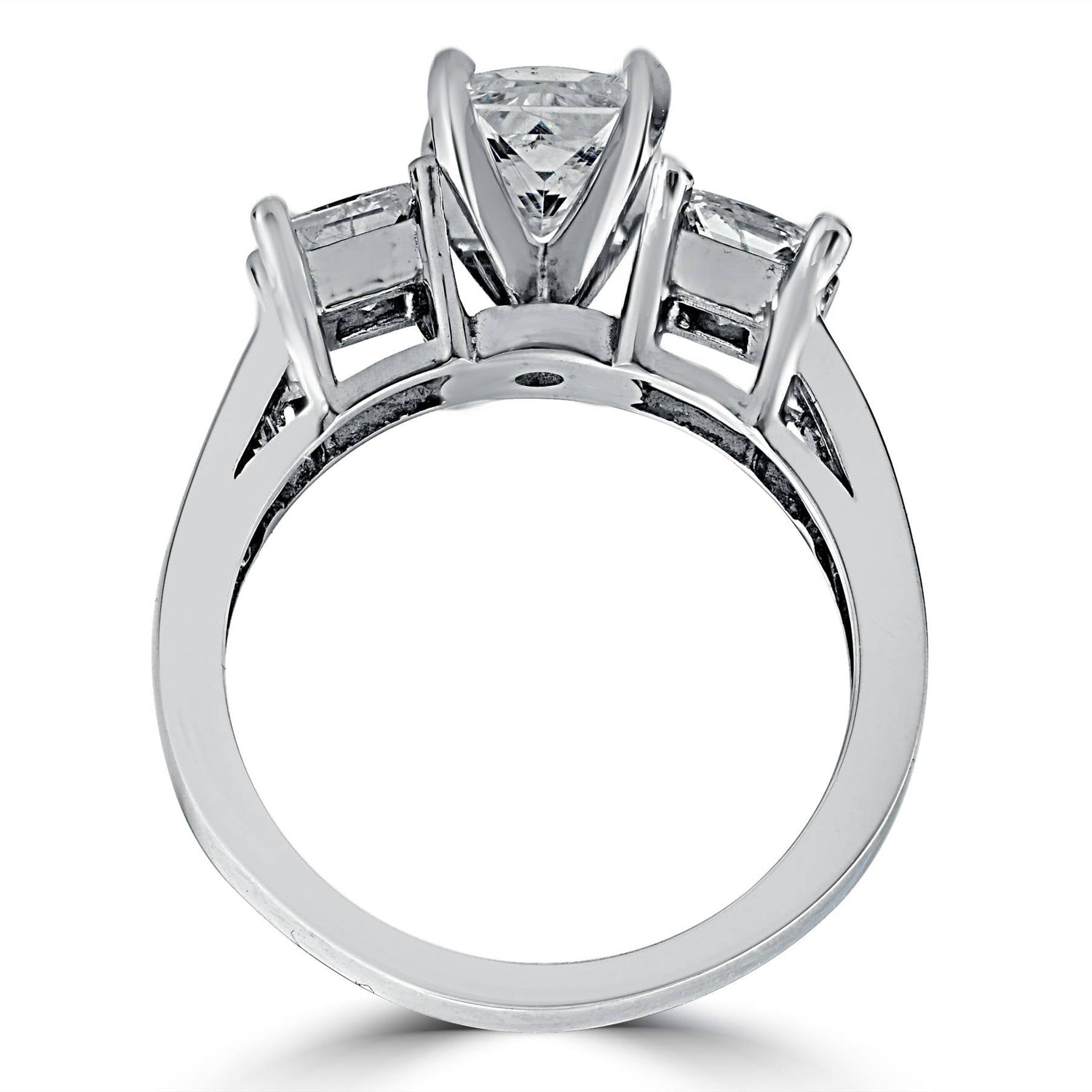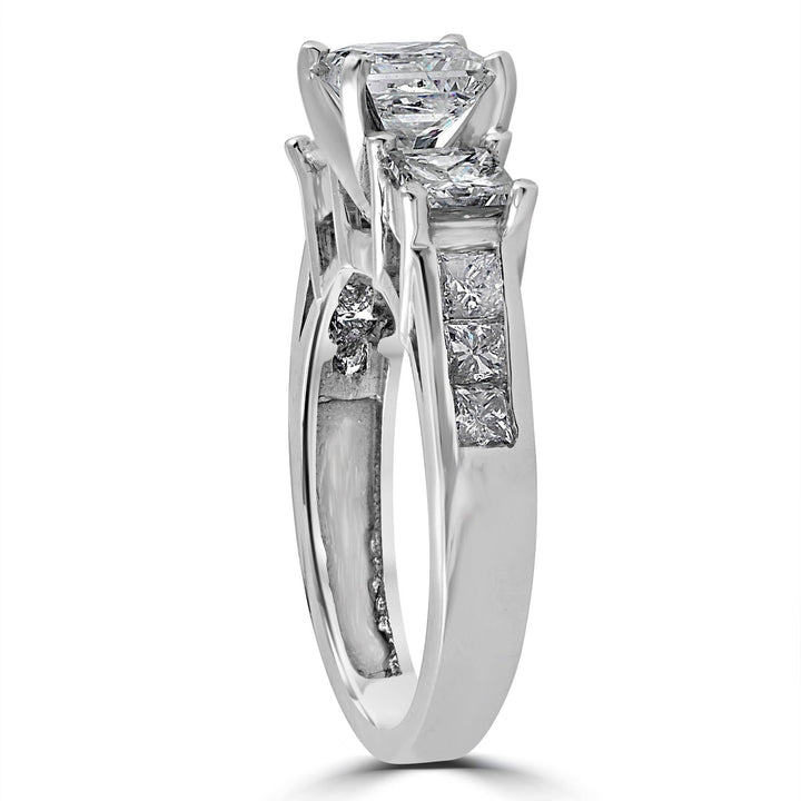 Handcrafted in 14k white gold with a 1ct center princess cut diamond and two 1/3ct side stones, totaling 2ct. Diamond clarity: I2-I3, color: G-H.