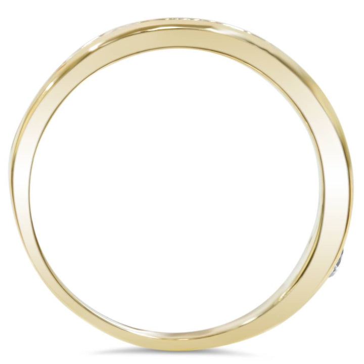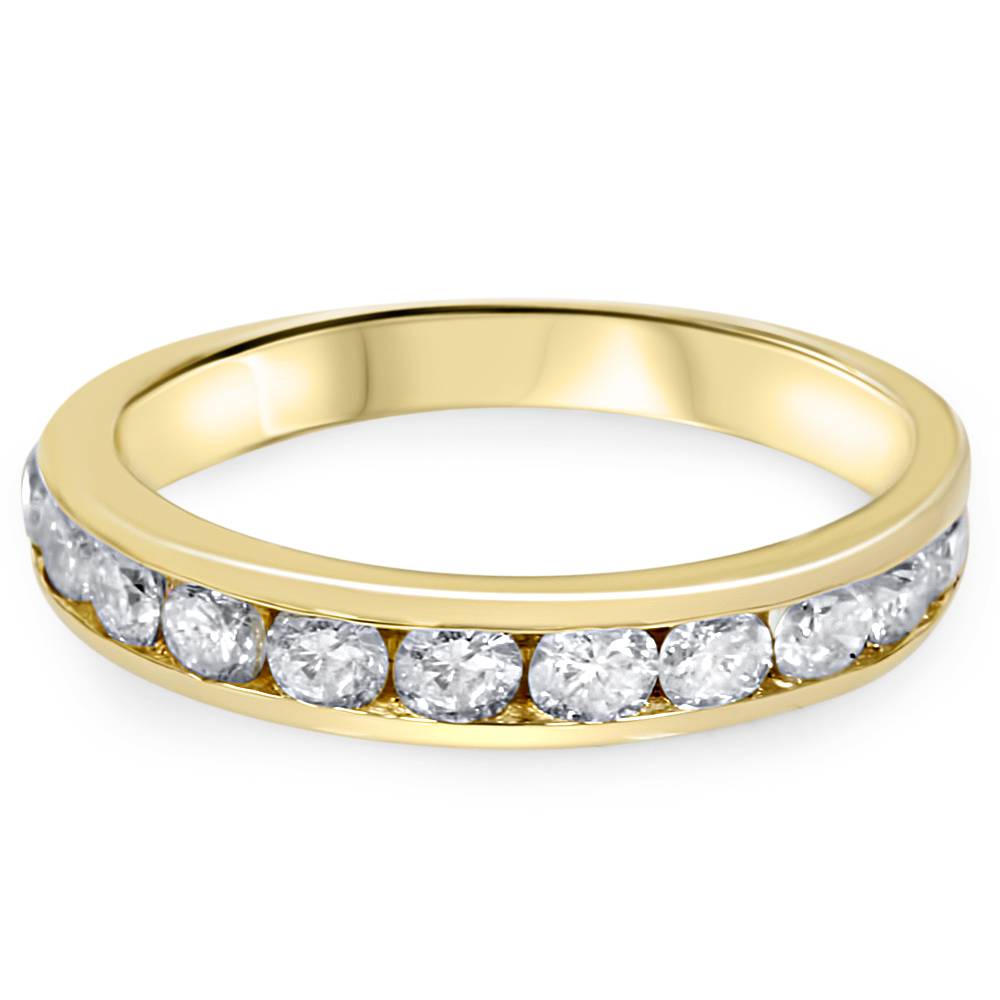 This 1 Ct Round Cut Channel Set Diamond Wedding Women's Ring in 14K Yellow Gold by Pompeii3 is an elegant wedding band that features 11 round brilliant cut natural diamonds, channel set in solid 14k yellow gold. With a total diamond weight of 1 carat, this ring exudes timeless beauty and is perfect for pairing with an engagement ring or wearing alone. Its simple yet elegant design makes it ideal for daily wear.