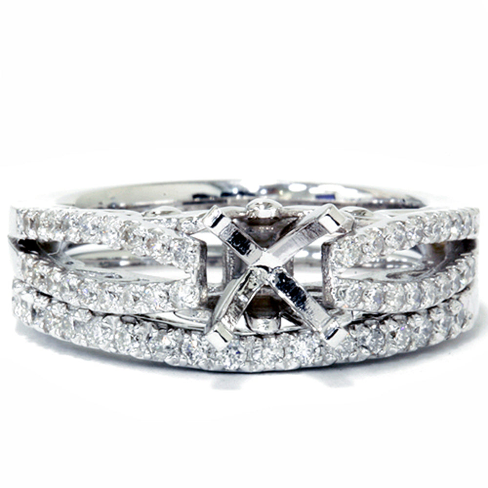 Handcrafted in solid 14k white gold with 53 round cut natural diamonds totaling 3/4 carat weight. Mount accommodates round or square center stones up to 1ct.