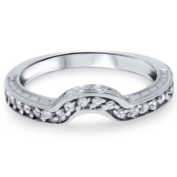 This 1/4ct Notched Wedding Ring Curved Antique Enhancer by Pompeii3 offers vintage elegance and intricate craftsmanship. With hand-engraved details and sparkling diamonds, this unique enhancer adds timeless beauty and sophistication to your bridal set.