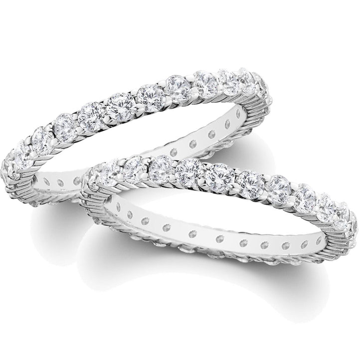 This 2ct Diamond Eternity Stackable Wedding Ring Set by Pompeii3 represents endless love and radiance. Each ring in the set is encircled with brilliant diamonds, perfect for stacking or wearing solo to make a sparkling statement.